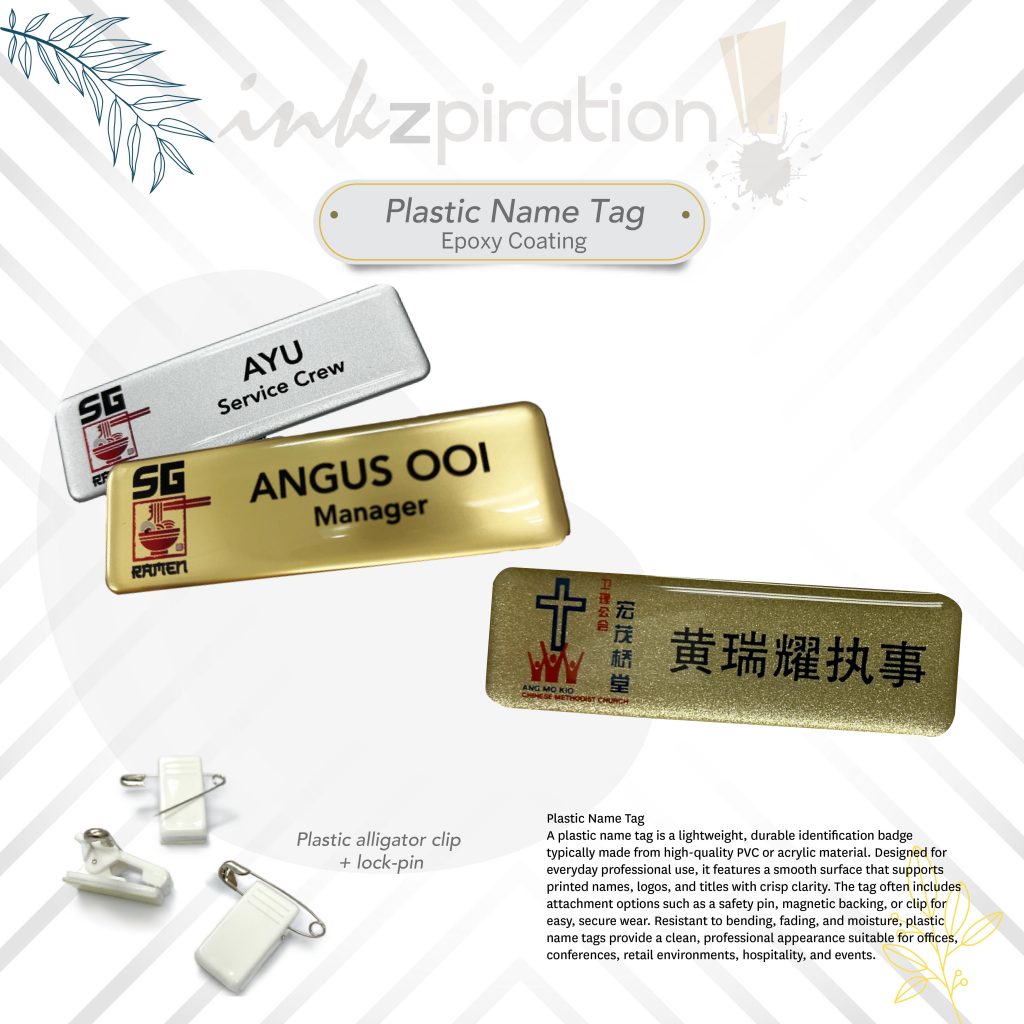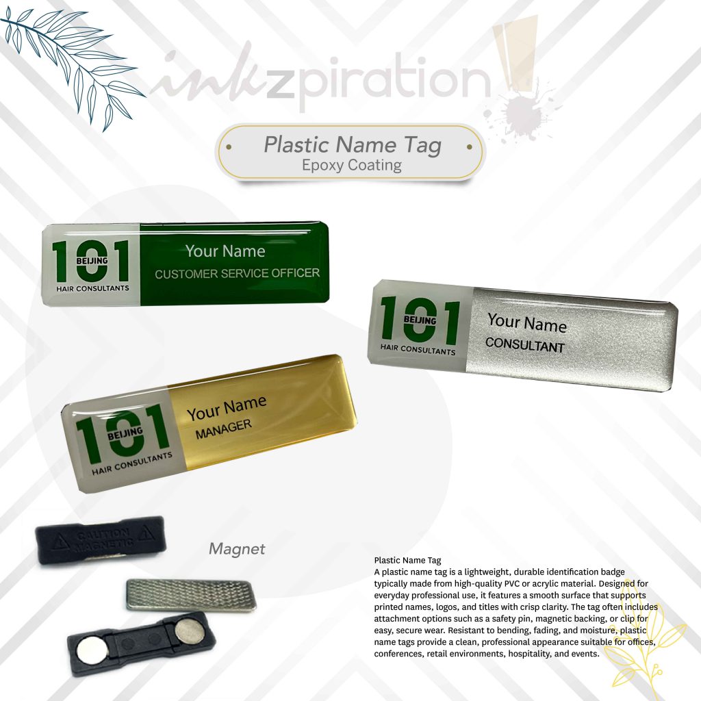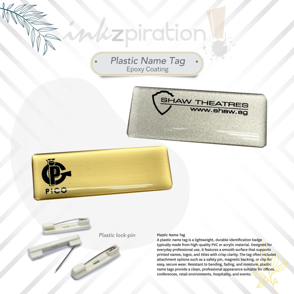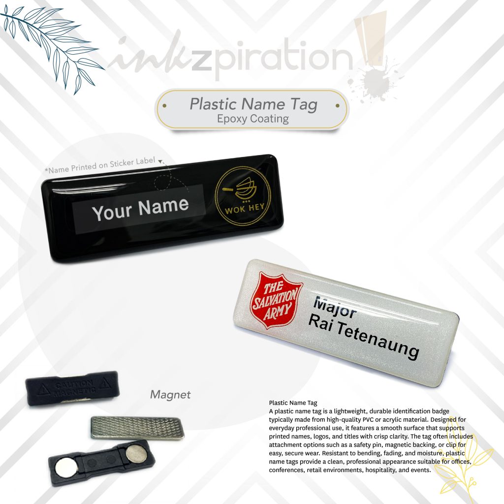 Local supplier for plastic name tags. Get it customized with Epoxy coating or none.